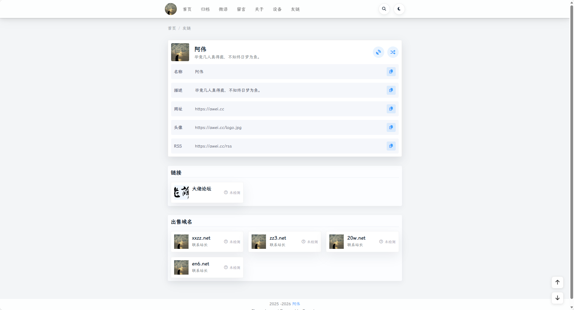 主题提供首页文章卡片、文章详情页、关于页、友链页、装备页、微语页、留言页、归档页等完整页面体系,支持深色模式、站内搜索、首页通知、浏览量统计、评论增强和自定义 RSS。